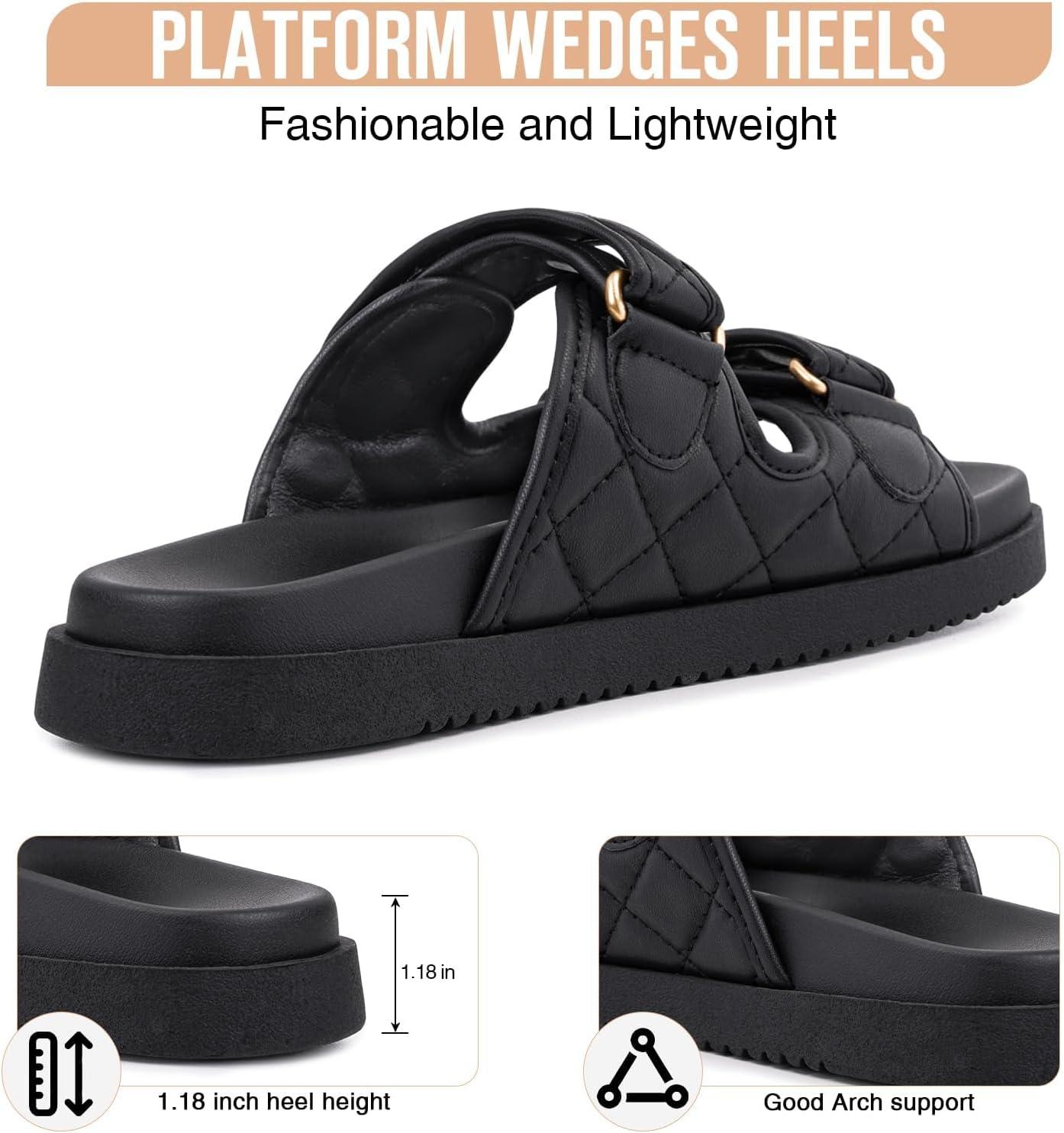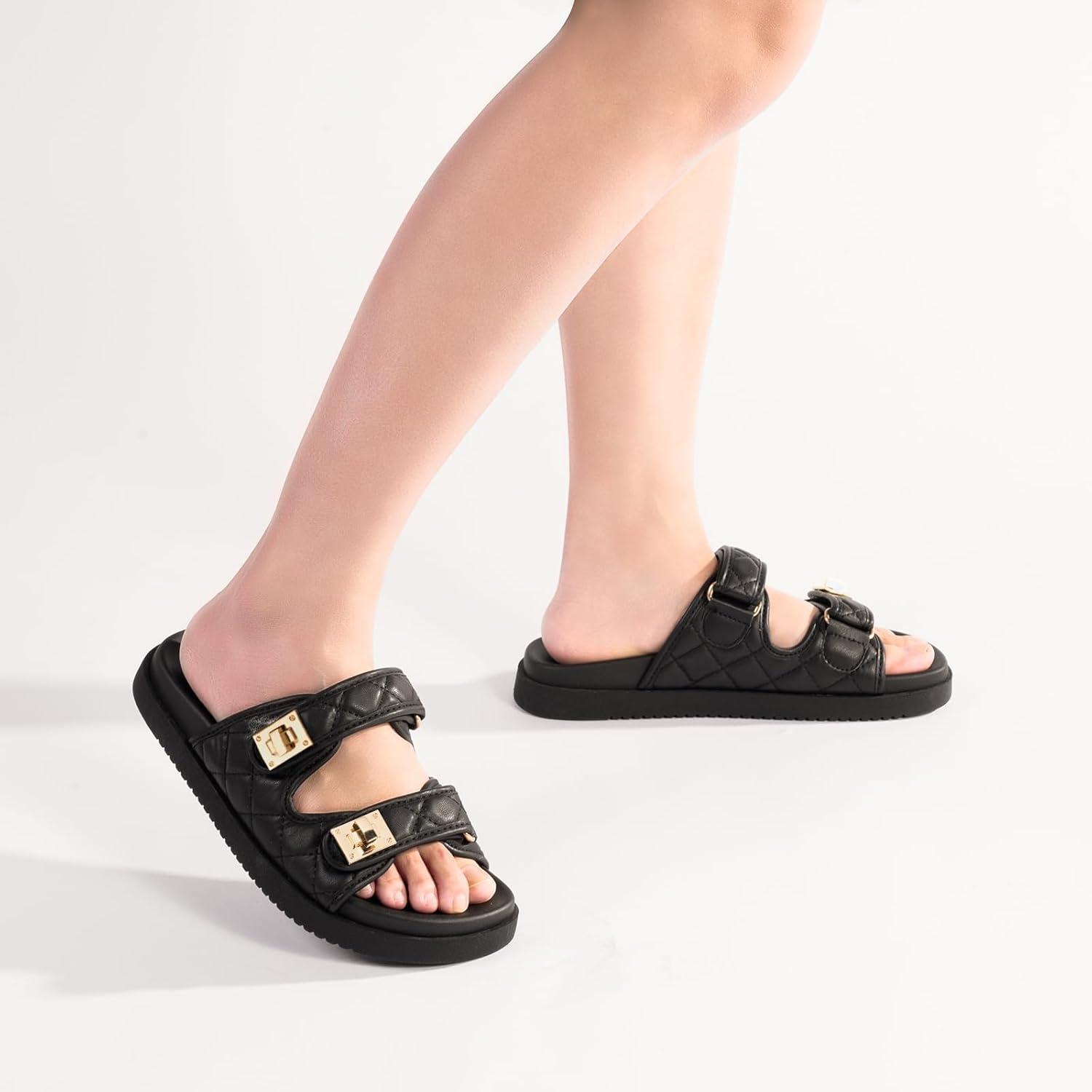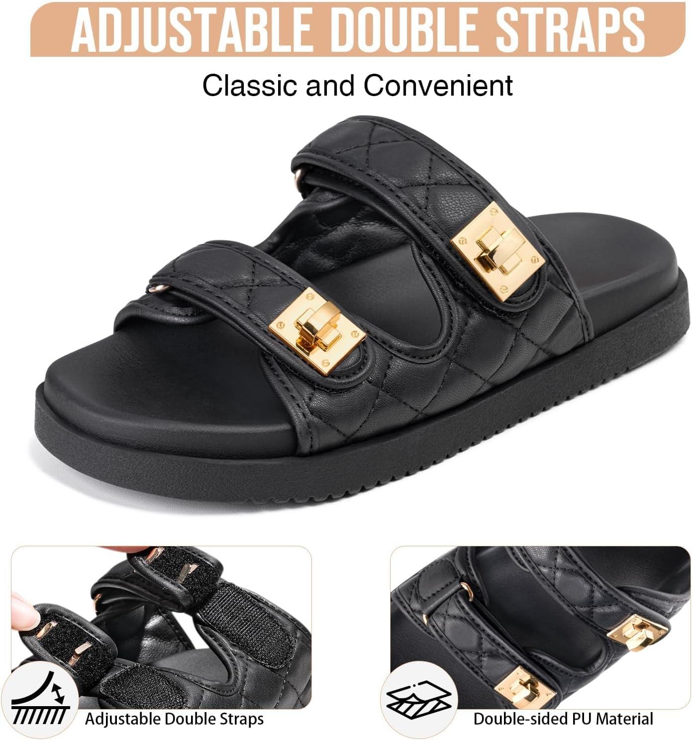 FITORY Women’s Flat Sandals Classic Adjustable Double Strap Slip On Casual Summer Slide Size 6-11(Black-2105)