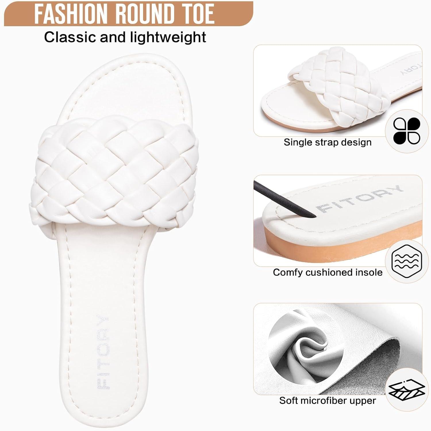 FITORY Womens Flat Sandals Fashion Round Open Toe Slip On Slides with Braided Strap Slippers for Summer Size 6-11(All White)