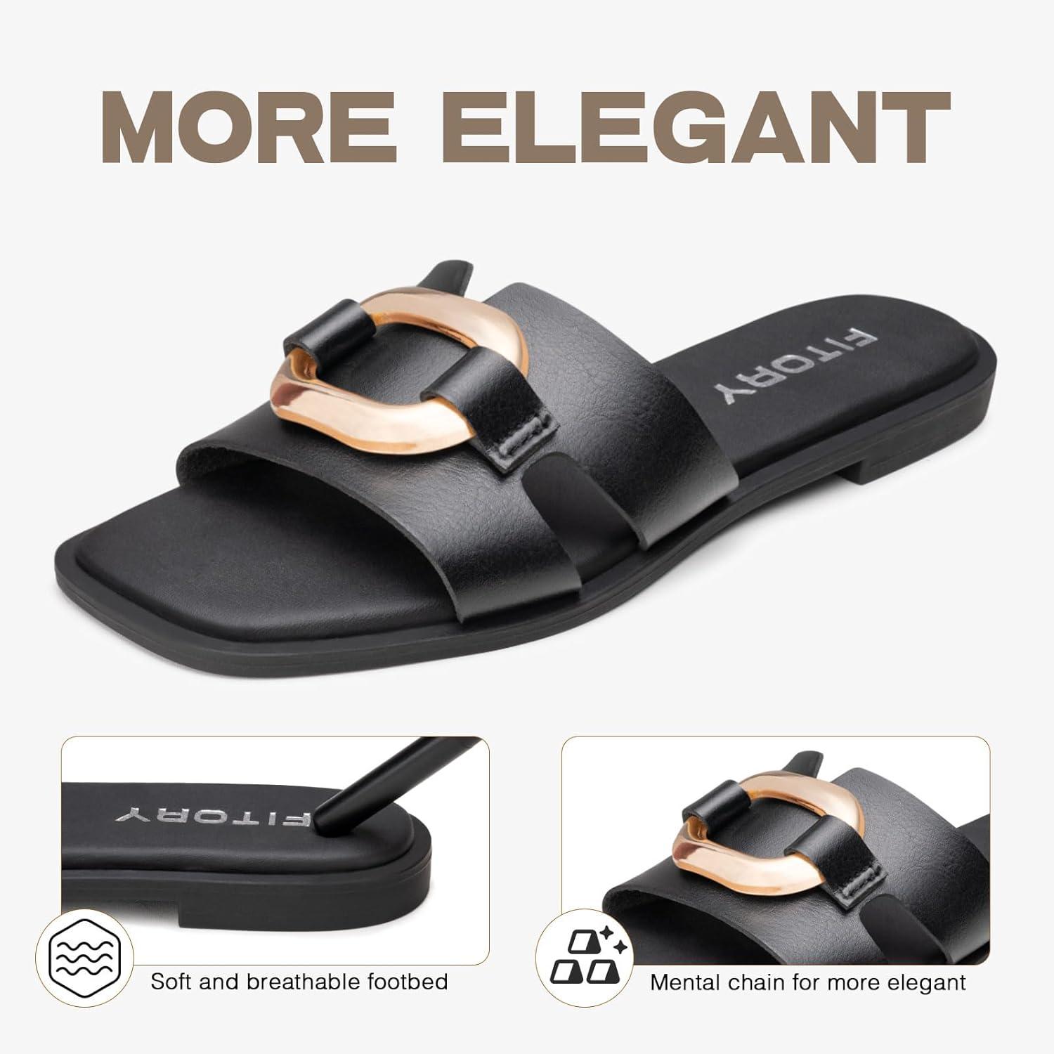 FITORY Women’s Flat Sandals Fashion Square Open Toe Slides With Metal Chain Slippers for Summer Size 6-11(All Black)